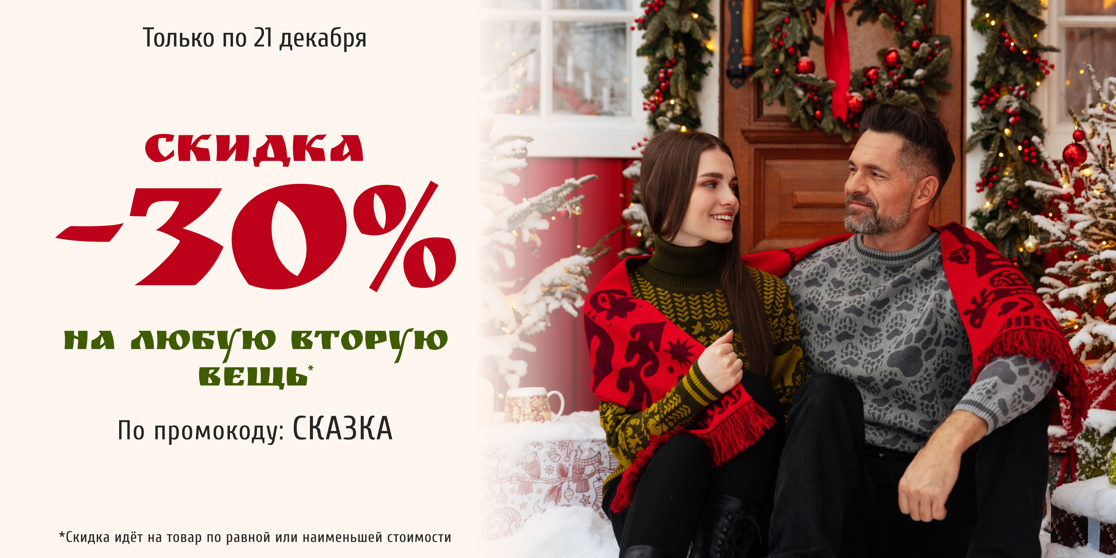Только с 16 по 21 декабря дарим Вам шанс обновить гардероб выгоднее: получите скидку 30 % на любую вторую вещь в заказе.🎁