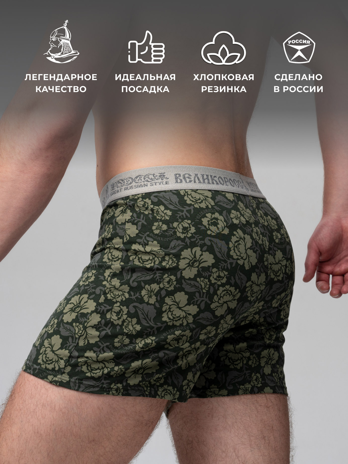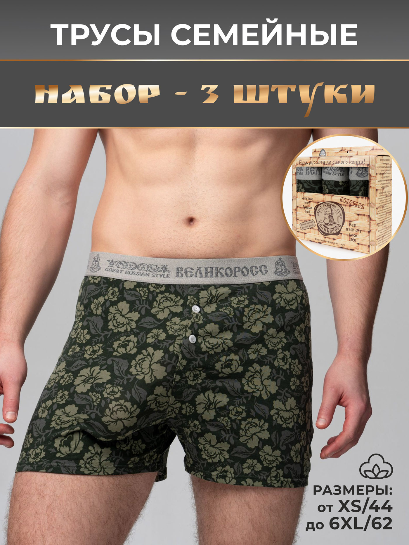Принтованные семейные трусы из набора от «Великоросс» сочетают яркий дизайн, комфорт и качество. Натуральные материалы обеспечивают удобство при носке.