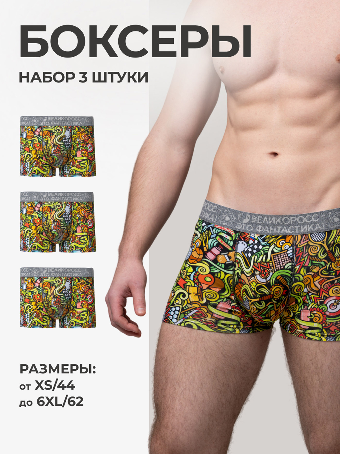 Легендарный набор принтованных боксеров Великоросс из 3 штук. Удобные, комфортные и долговечные. Широкая мягкая резинка с хлопковым покрытием не давит и не скручивается. Трикотаж высокого качества не линяет и не выцветает после стирки. Натуральный хлопок гипоаллергенен, отводит влагу и позволяет коже дышать, не перегревая тело.