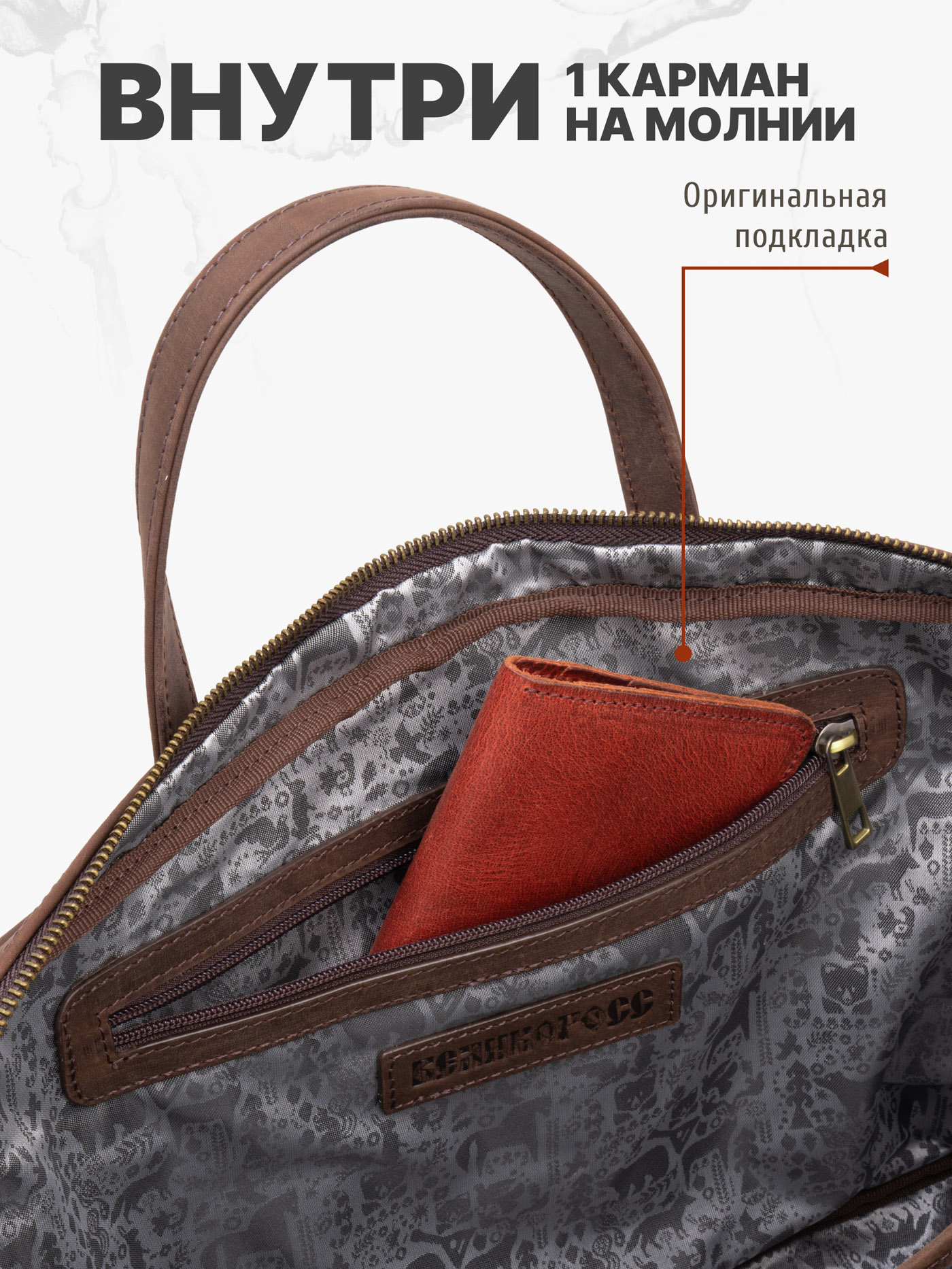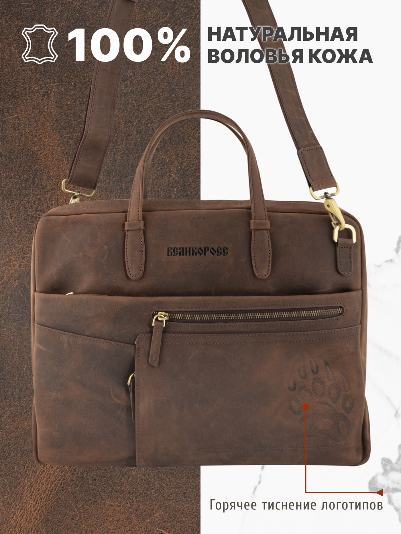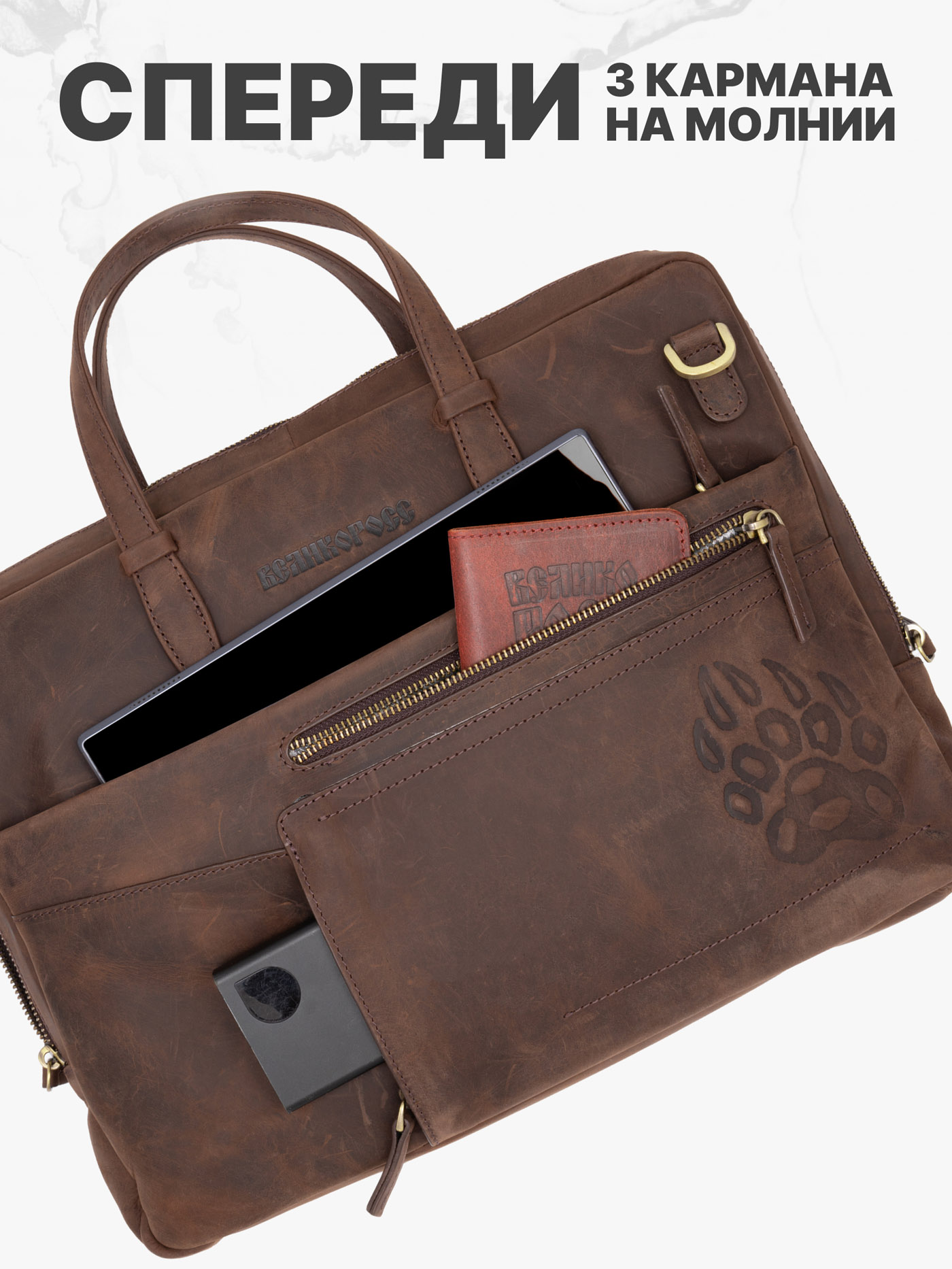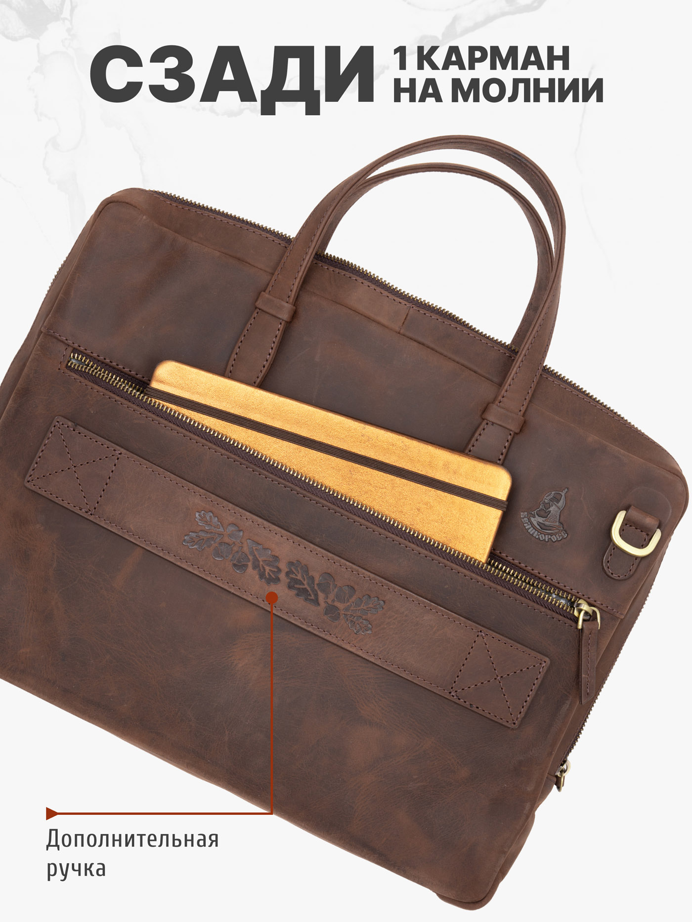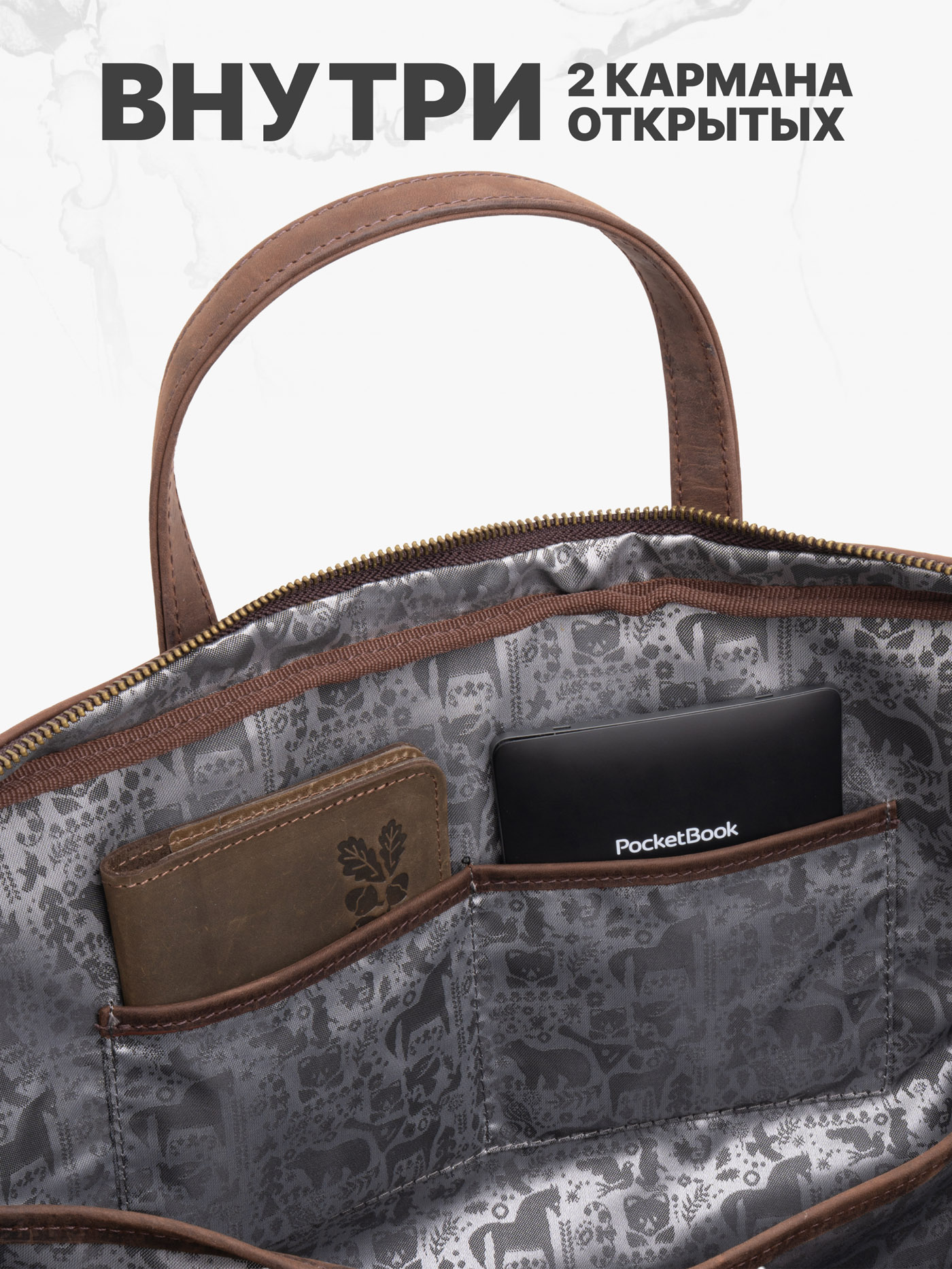 Портфель ВЕЛИКОРОСС из премиальной кожи выглядит солидно и статусно. А скромный элемент в Русском стиле — нанесённый горячим тиснением орнамент на наружном кармане — будет всегда напоминать всем вокруг о Вашей любви к Родине, о Вашей огромной внутренней Силе и уверенности в своём Правильном Выборе! А оригинальная подкладка с обитателями Русского Леса согреет Вашу душу, и заставит всех вокруг восхищаться Вашему уникальному Русскому Стилю!