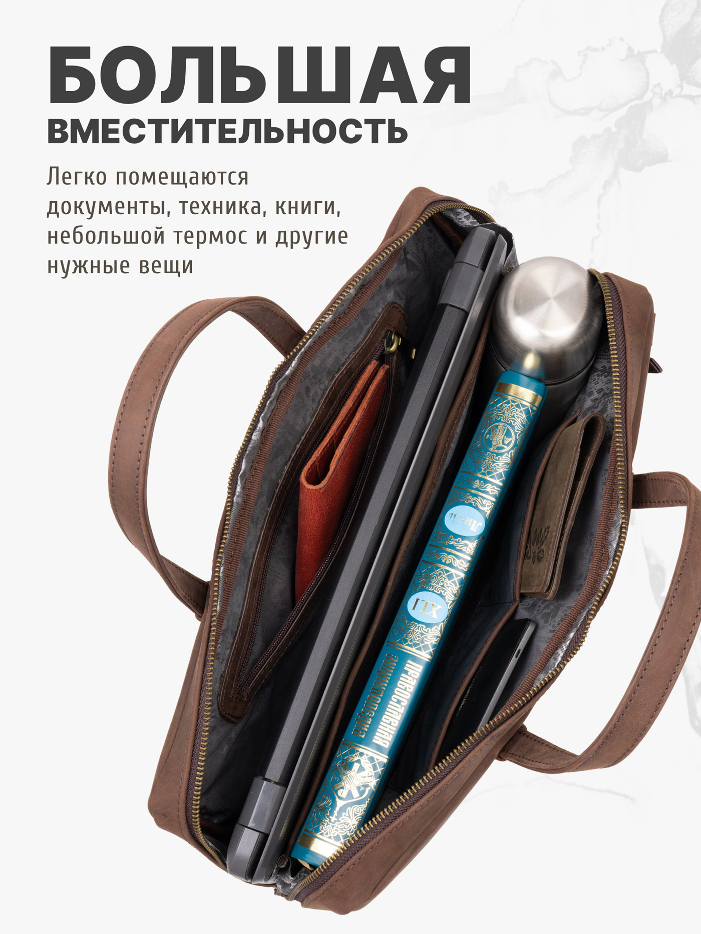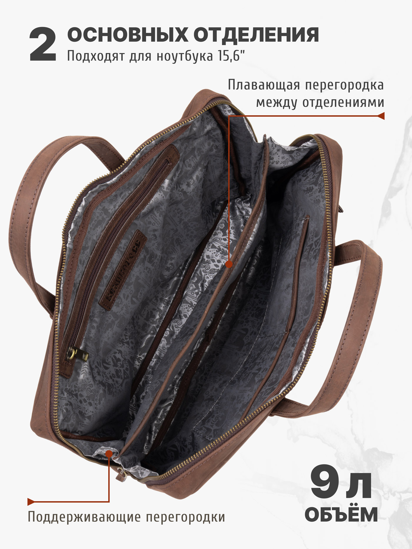 С виду компактный и стильный, этот портфель очень вместителен. В нём прекрасно поместится главное орудие современного человека — планшет или ноутбук с диагональю до 15". Также в сумке можно переносить важные документы разного формата, папки с необходимыми бумагами — отделения под надёжными замками-молниями позволят сохранить ценности в чистоте и сохранности. Также имеются удобные наружные карманы с прочным замком, в которые удобно складывать нужные вещицы — ключи, карты, гаджеты, бумажники... – они точно не выпадут и не затеряются.