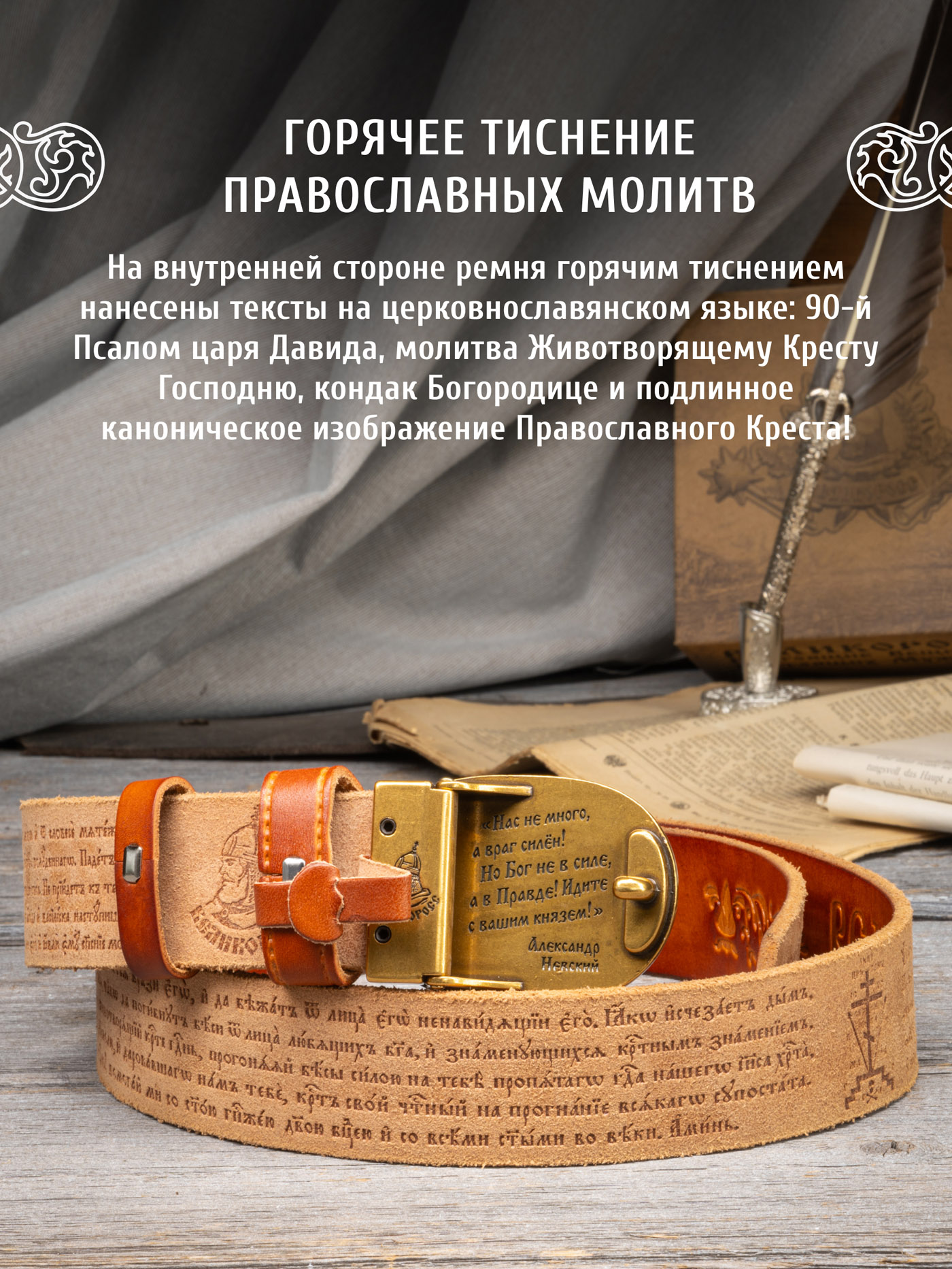 Красивый, приятного цвета ремень, тиснение молитвы просто бесподобное! Коробка для подарка в самый раз.
