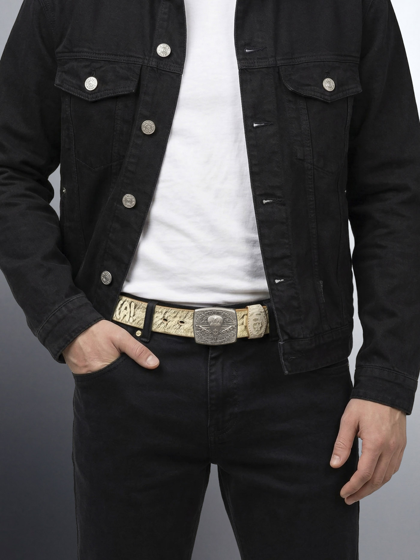 Ремень белого цвета, бляха с военной символикой смотрится просто ураган! Рекомендую!