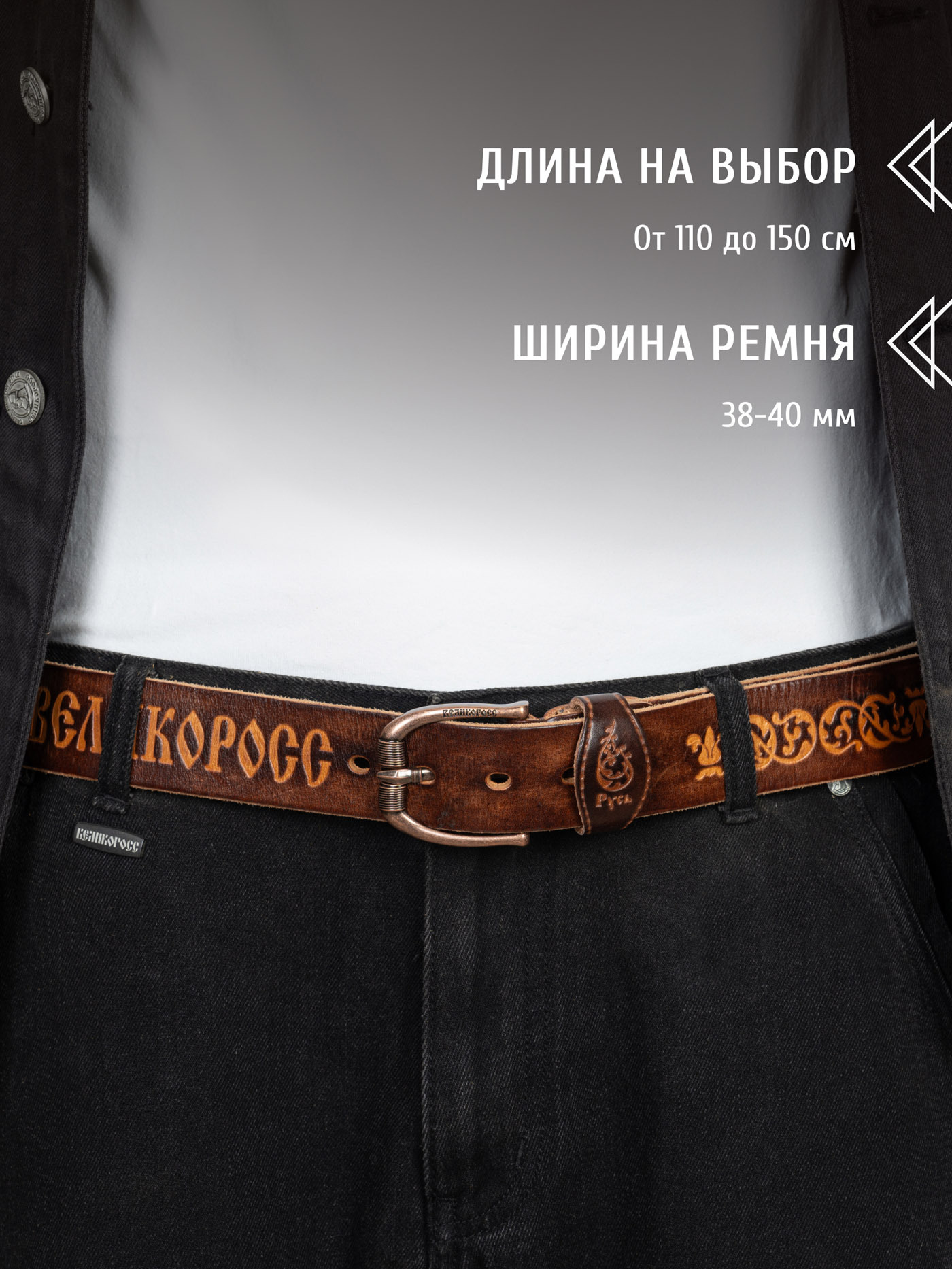 Премиальный ремень из натуральной воловьей кожи толщиной 4 мм прослужит вам десятилетиями, сохраняя первозданный вид. Изделие украшено уникальным горячим тиснением Русских орнаментов, подчёркивающих вашу принадлежность к Великой России.