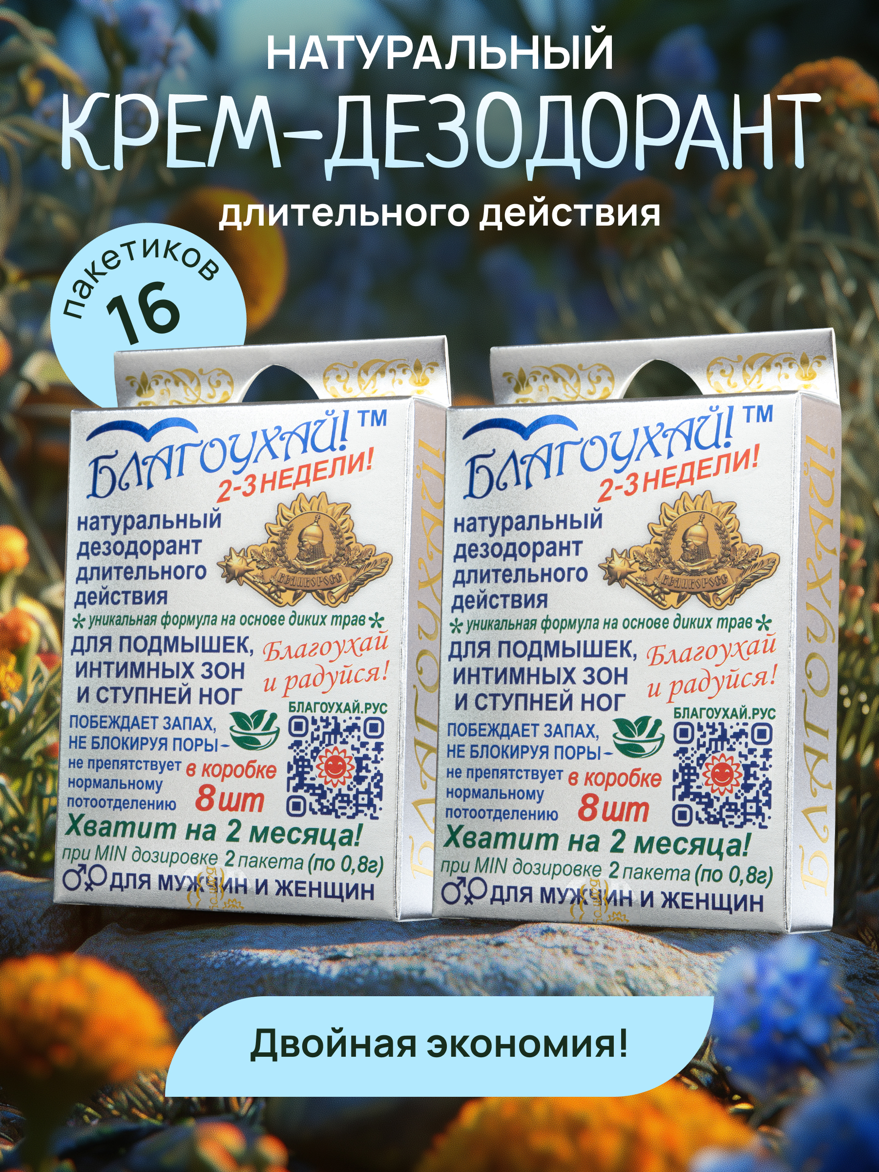«БЛАГОУХАЙ!» — уникальное средство — оно создаёт правильный баланс солей, белков и жиров в составе нашего пота и обеспечивает первозданную свежесть на 2–3 недели без раздражающих побочных эффектов!