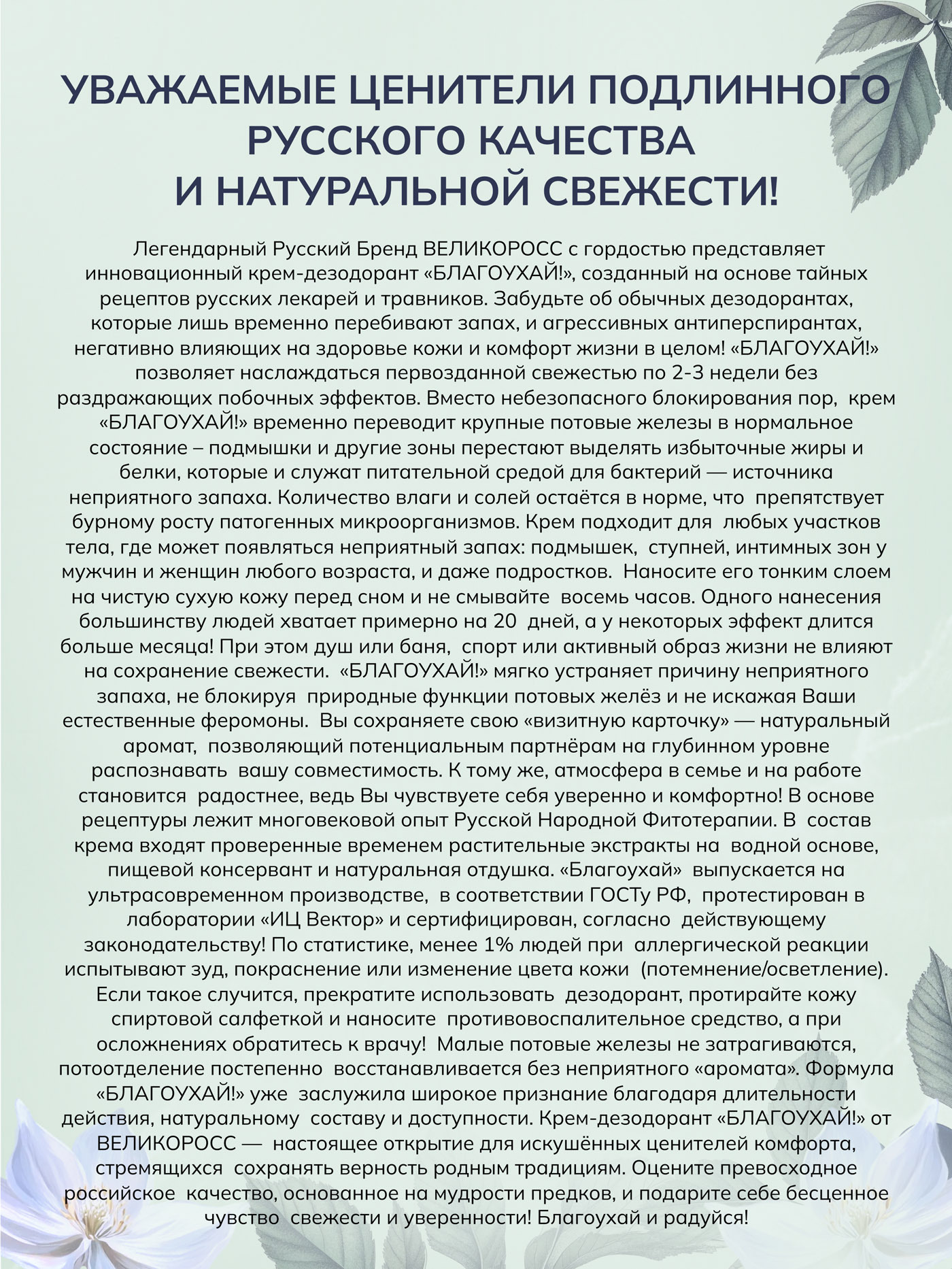 Крем-дезодорант «БЛАГОУХАЙ!» от ВЕЛИКОРОСС — это настоящее открытие для тех, кто стремится к абсолютному комфорту, сохраняя верность родным традициям. Оцените превосходство российского качества, основанного на мудрости наших предков! Ощутите Истинную Силу заботы от Матушки Природы. Подарите себе и близким долгое ощущение свежести и уверенности в себе вместе с «БЛАГОУХАЙ!» от любимого всеми Русского Бренда ВЕЛИКОРОСС!