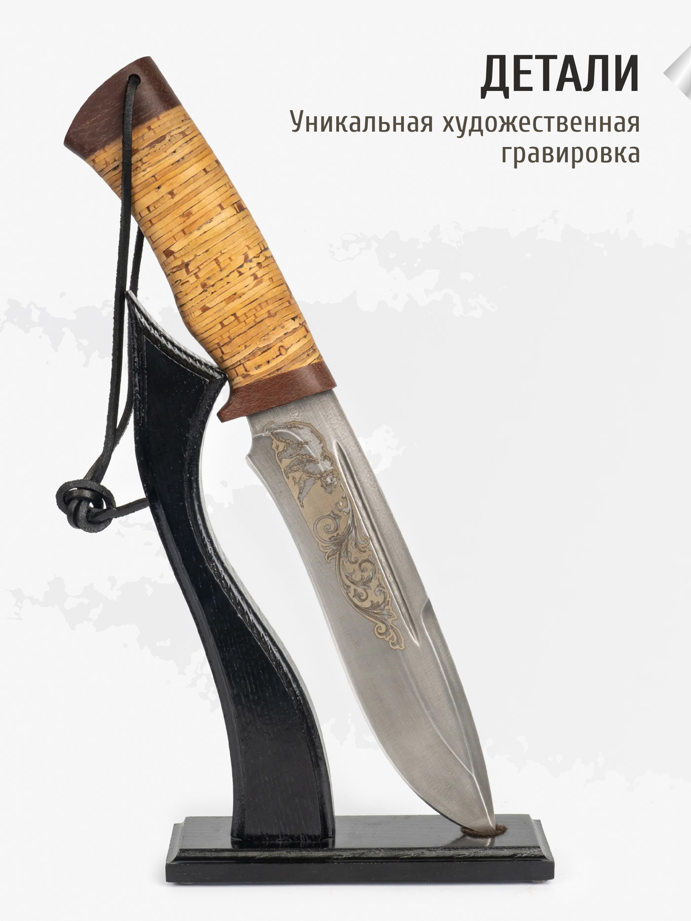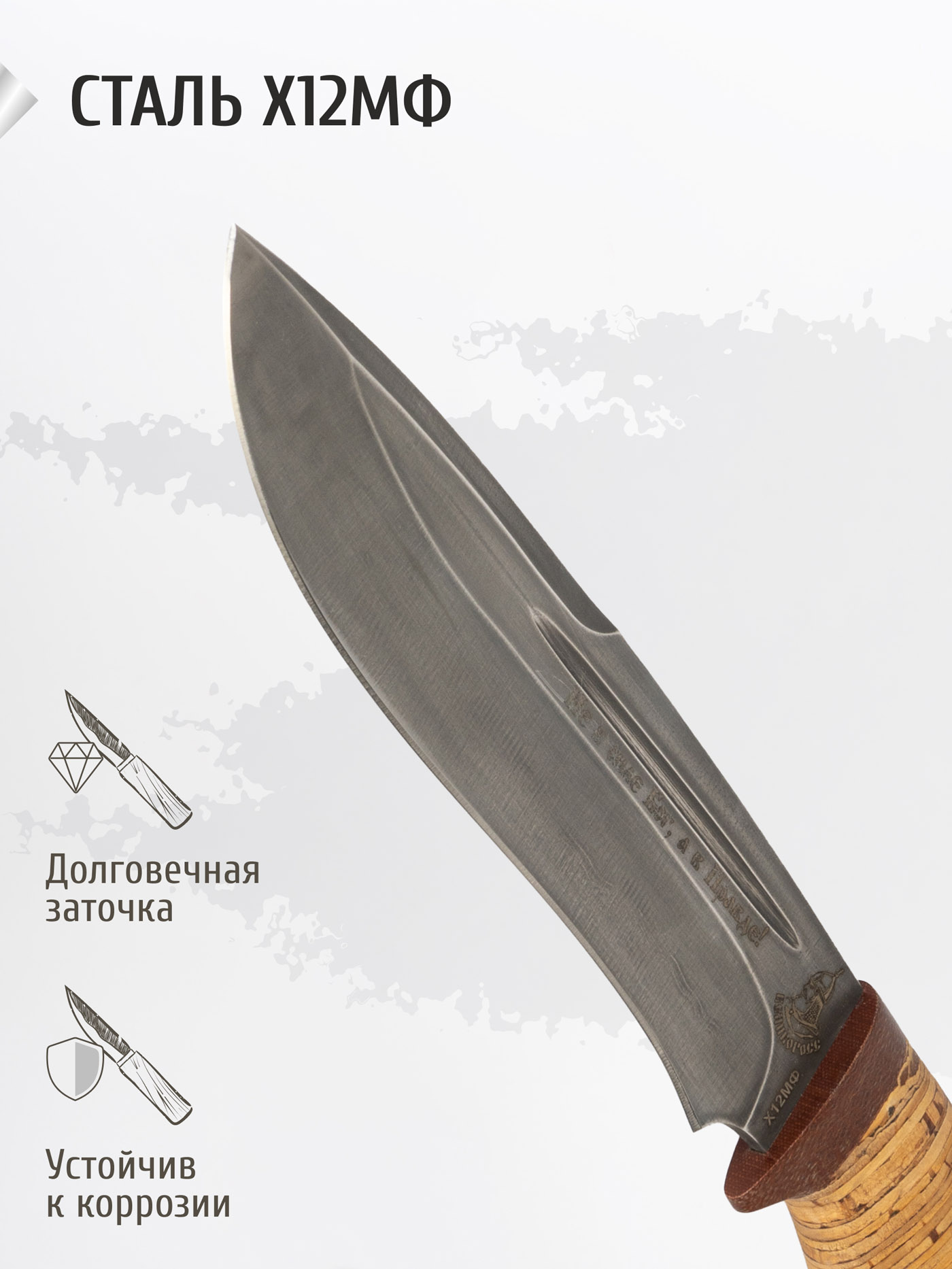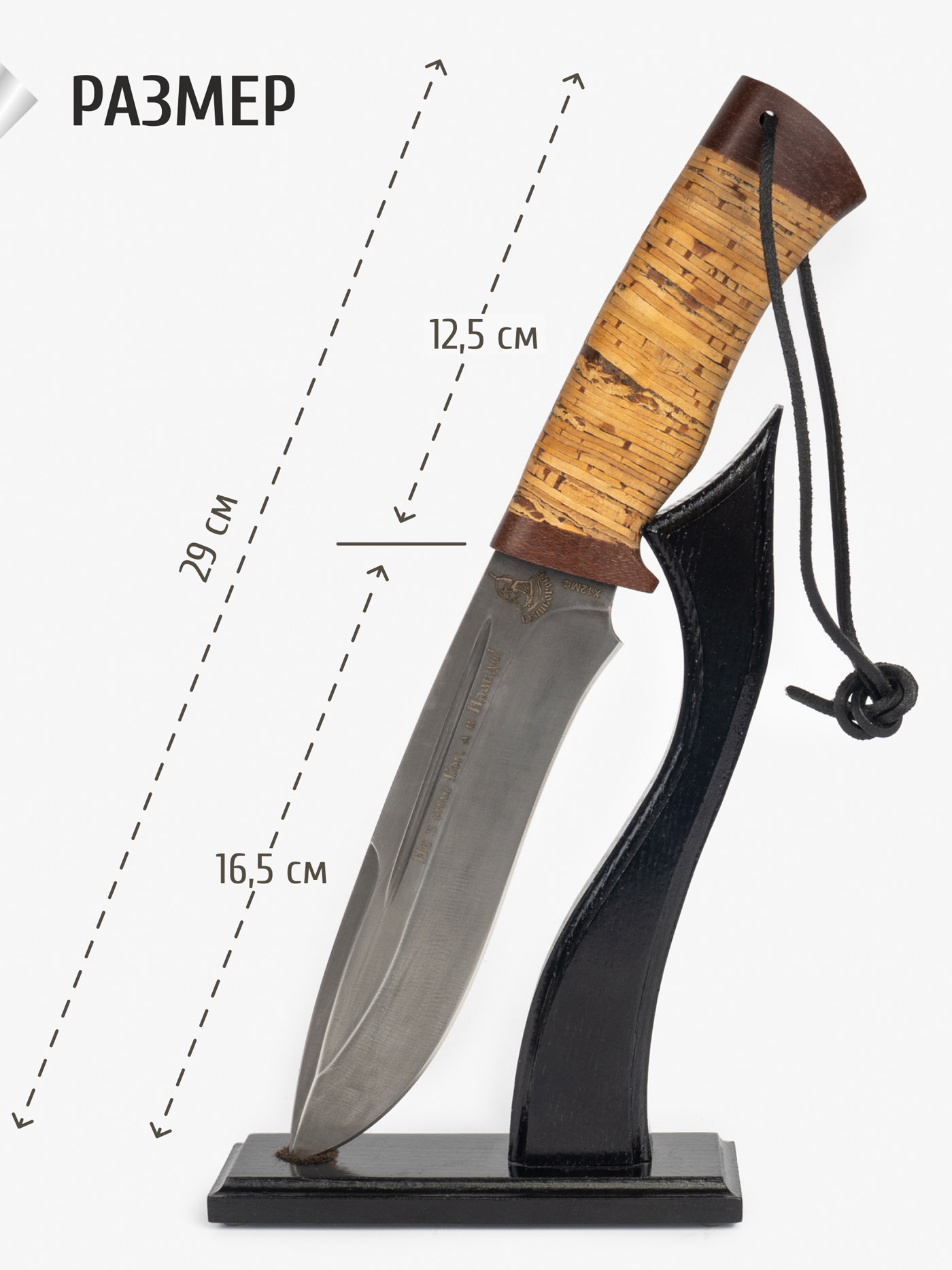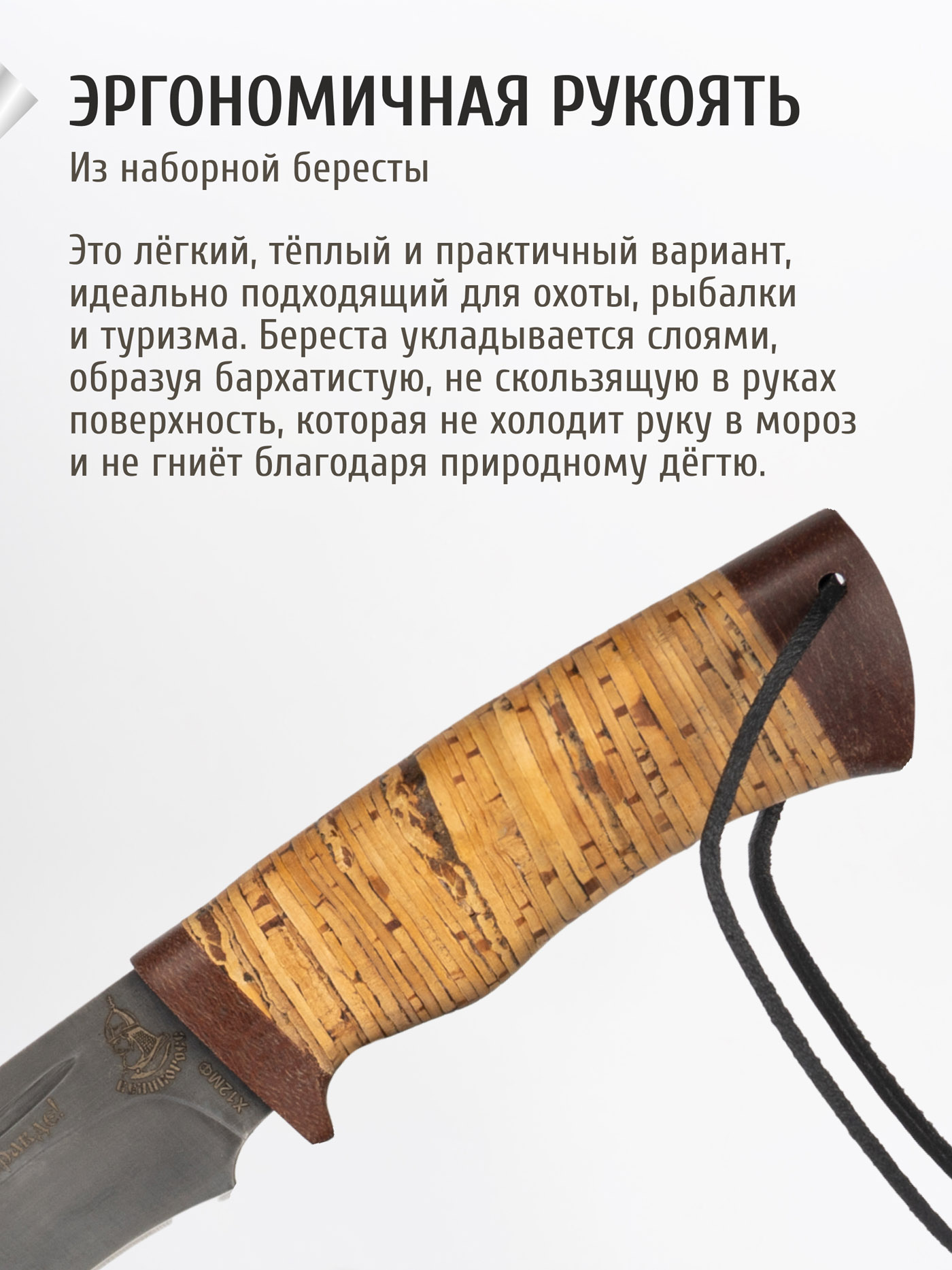 Нож качественный,режит быстро и отлично,не ржавеет,лезвие супер,ручка из бересты ,не скользит ,теле в футляре ,просто супер!