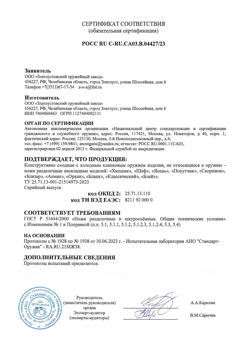 Безмерно рад ножу - всегда мечтал что-то надежное и надолго! Нож изготовлен классно - комар носа не подточит! Спасибо ВЕЛИКОРОСС!