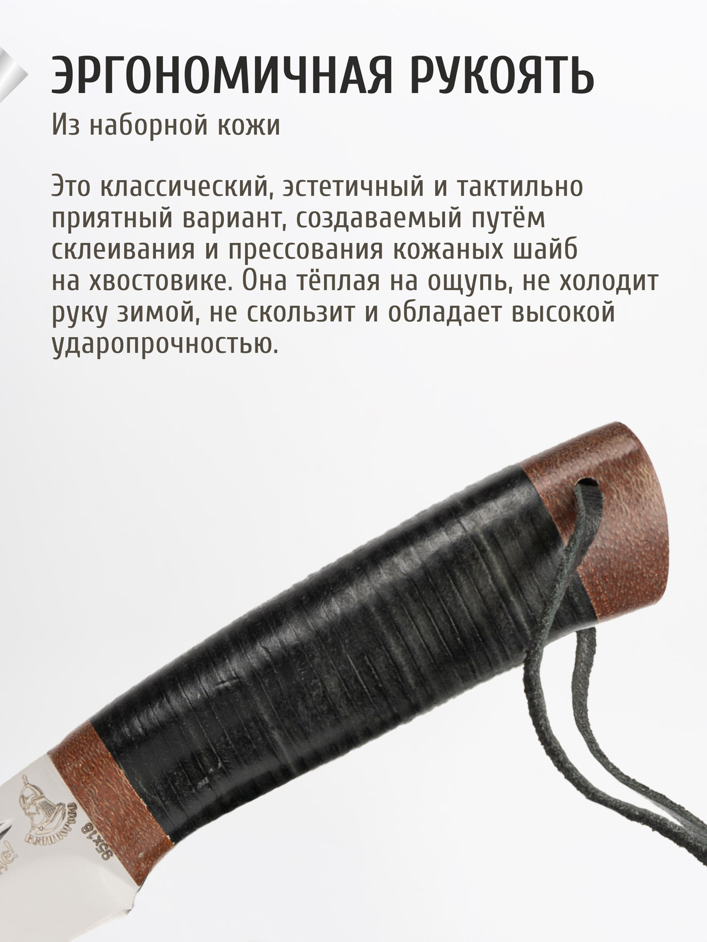 Рукоять из теплой кожи - приятно лежит в руке, лезвие ножа из отличной стали. Рекомендую!