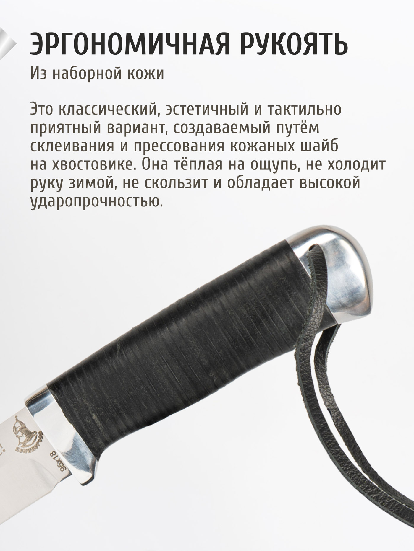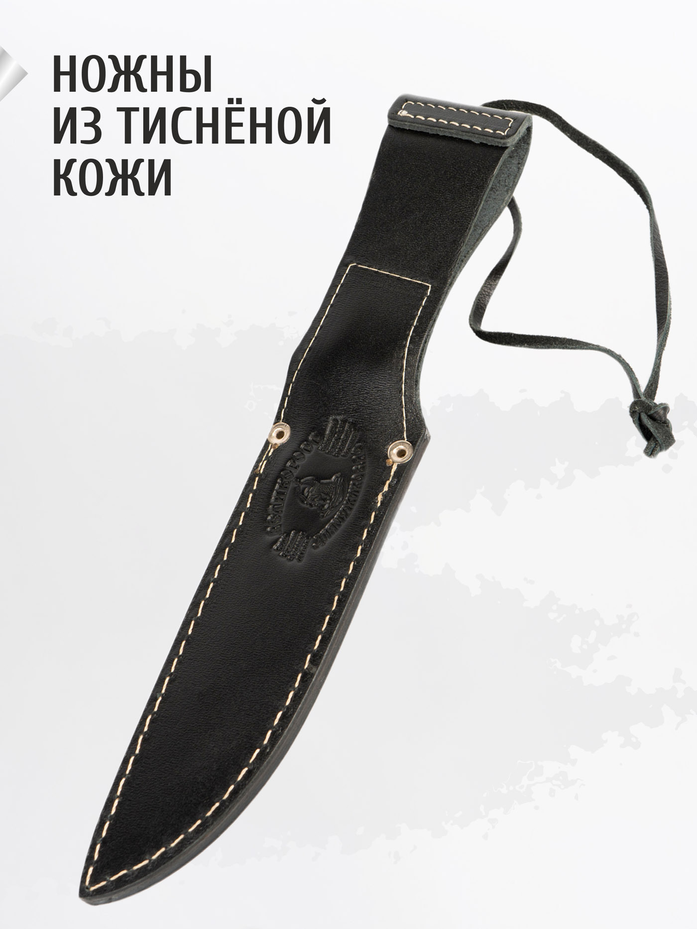 Нож изготовлен из нержавеющей стали, рукоять обтянута красивой кожей - в руке лежит отлично, ножны прошиты на совесть. Рекомендую!)