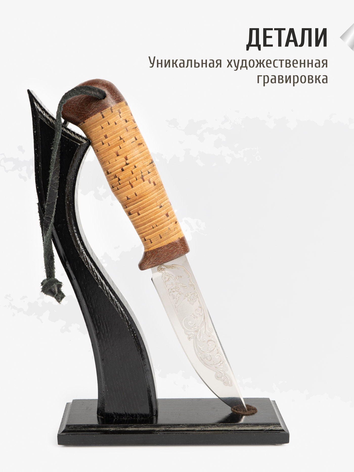 Красивый, стильный, нож отлично смотрится, красивый рисунок, удобная из бересты ручка.