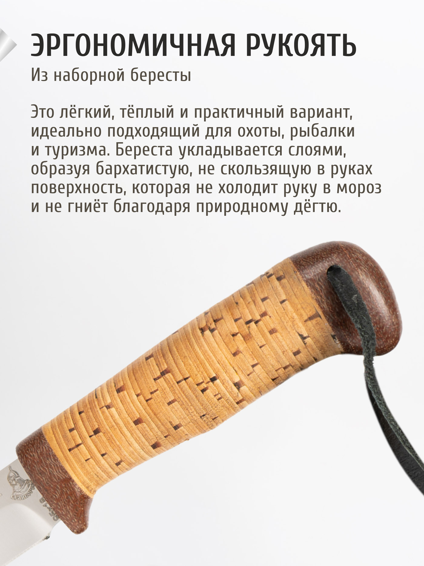 Отличный нож,удобный ,ручка из бересты ,острое лезвие .