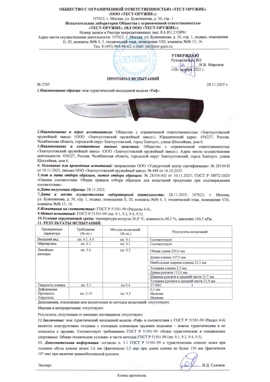 | Твердость клинка, HRC | 58 |