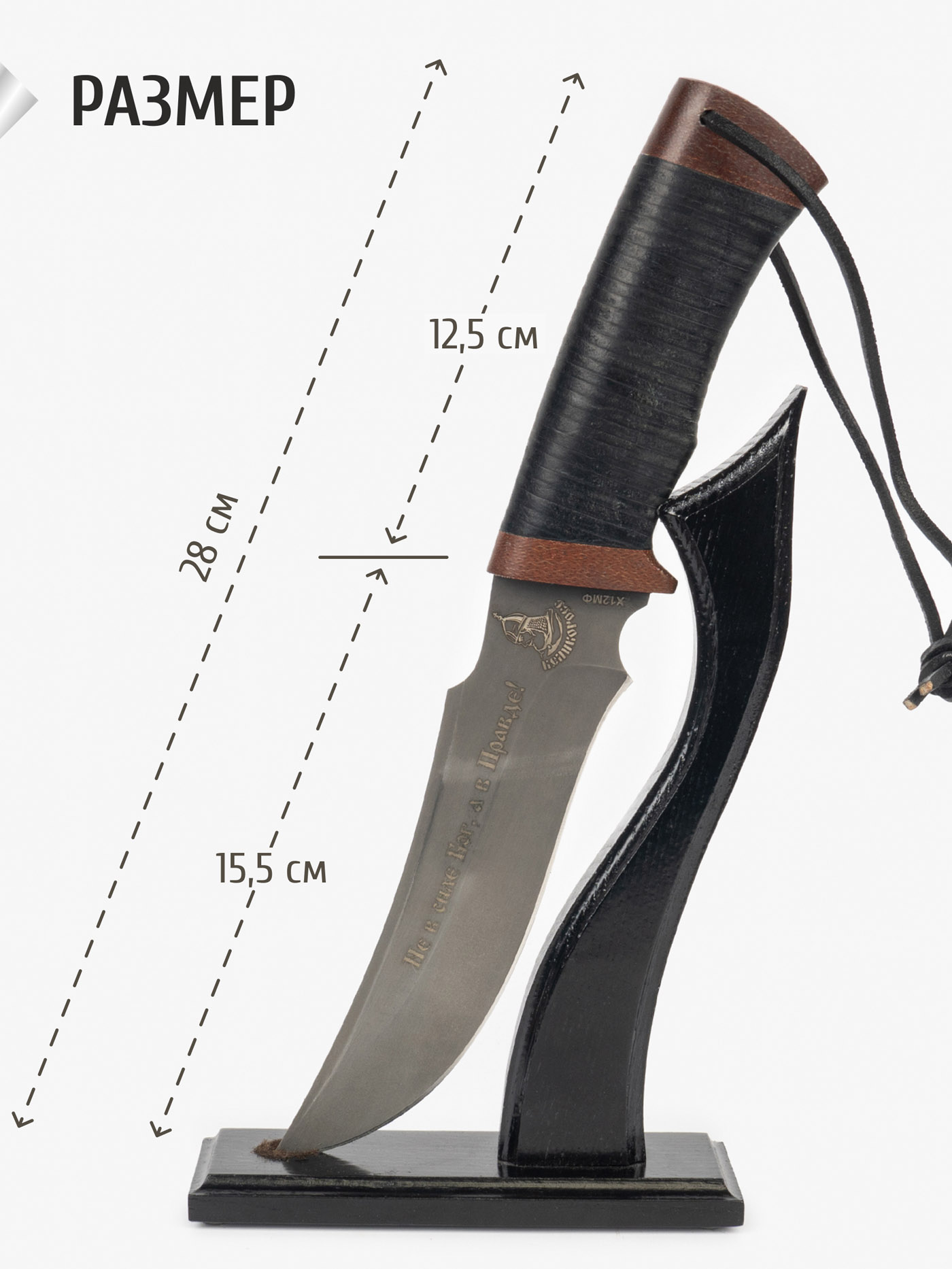 Брутальный нож, черная ручка из кожи придает ему шарм! Лезвие ножа заточено как бритва. Рекомендую!