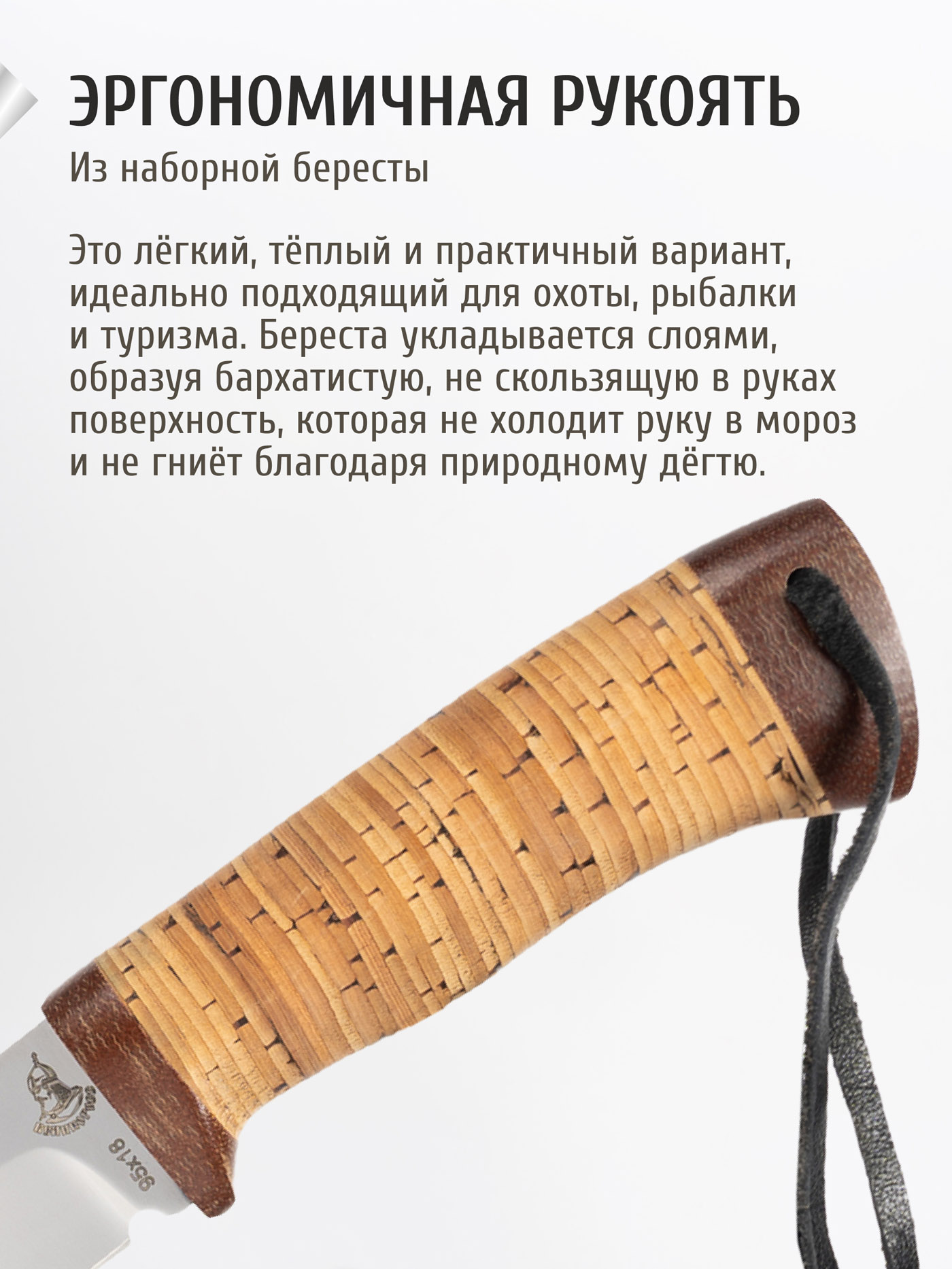 Классный нож, рукоятка из бересты хорошо лежит в руке, приятно удивлён качеством. Рекомендую!