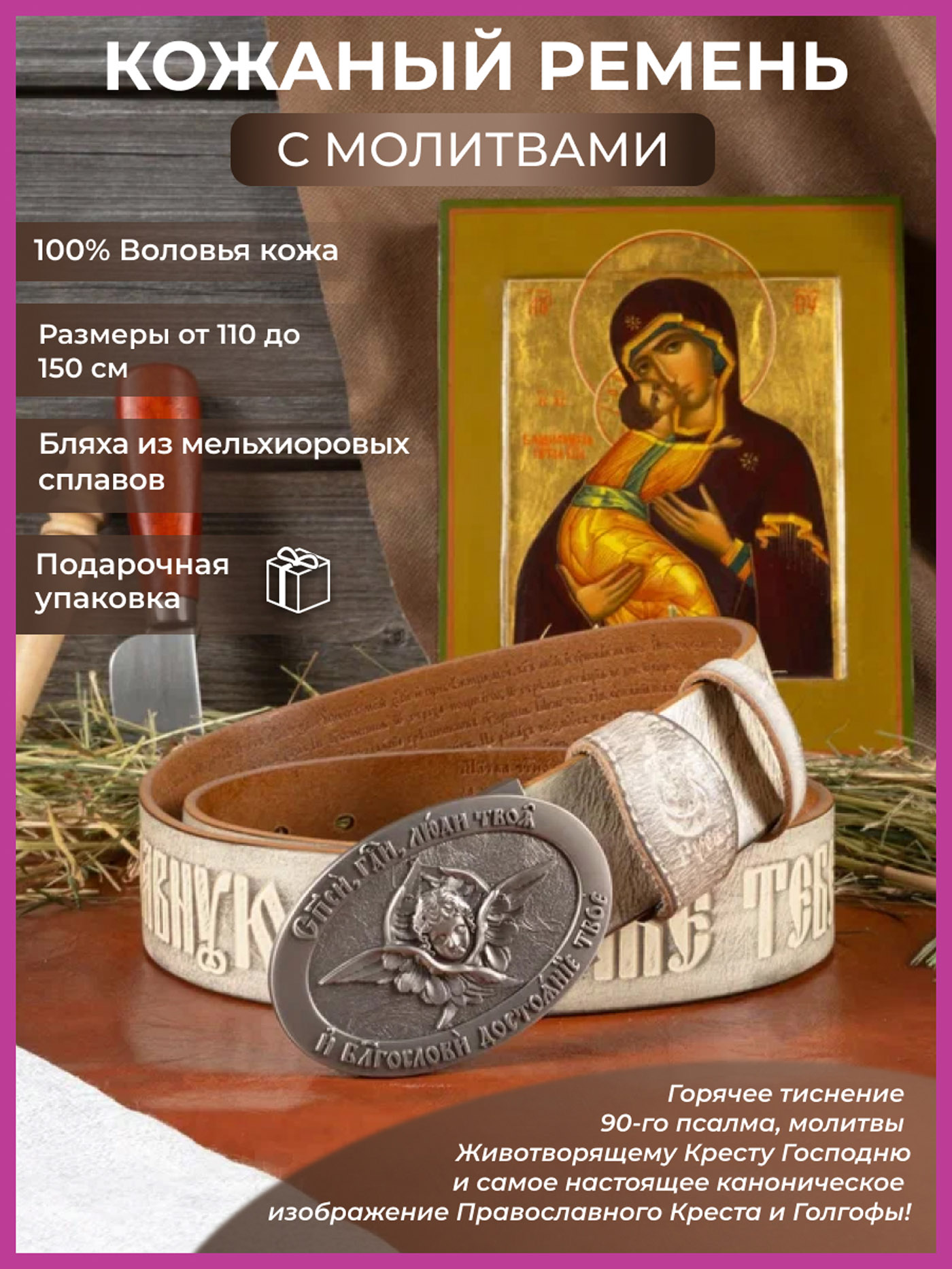Насыщенный цвет ремня с церковными молитвами - просто восхищает! Пряжка отлита чисто без брака. Советую к покупке)