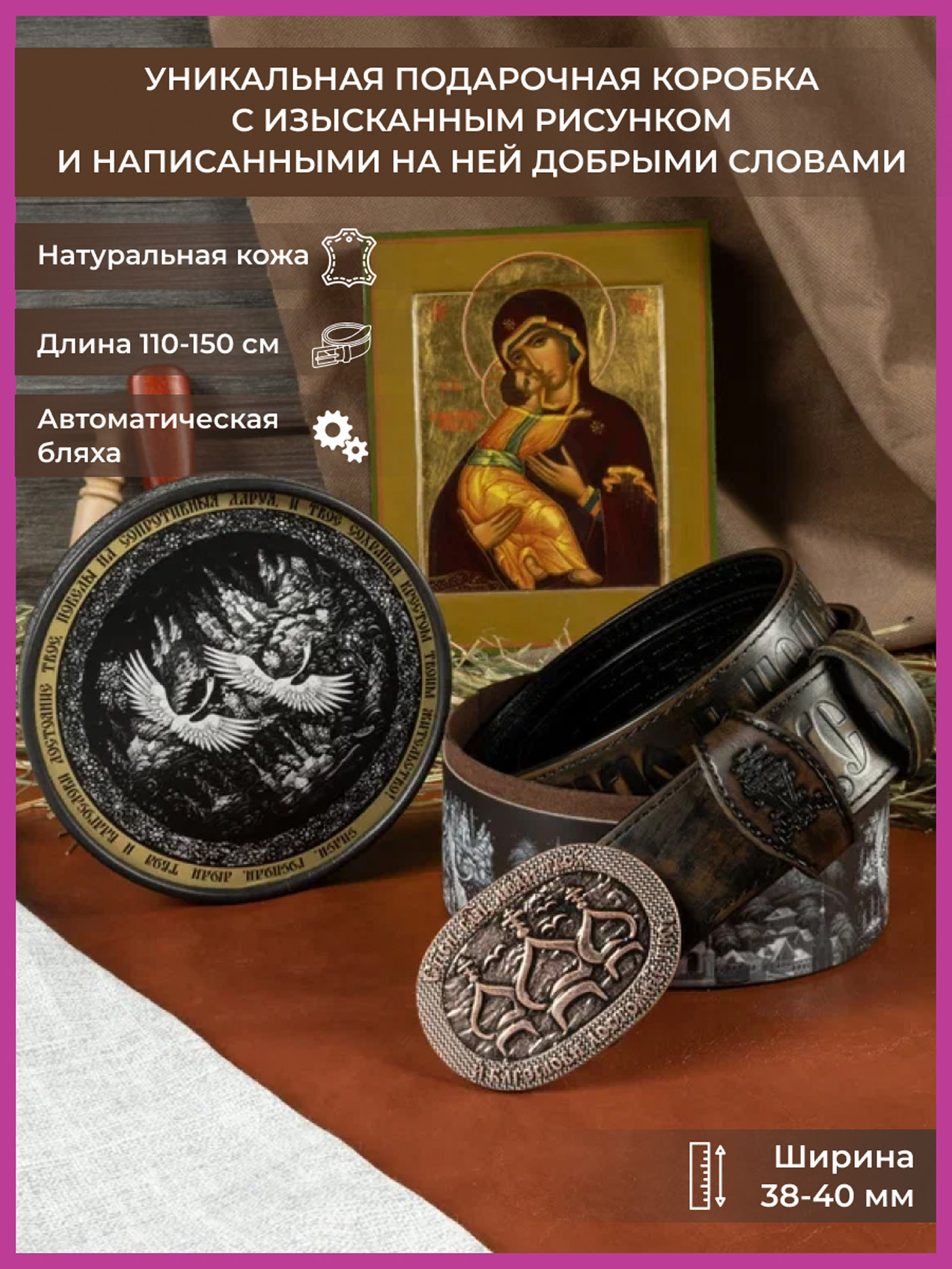 Заказала мужу этот ремень, ему очень понравился, шикарное качество красивая подарочная упаковка. Заказ быстро собрали и отправили. Менеджер Анастасия очень приветливая, помогла мне с оформлением заказа. Спасибо большое.