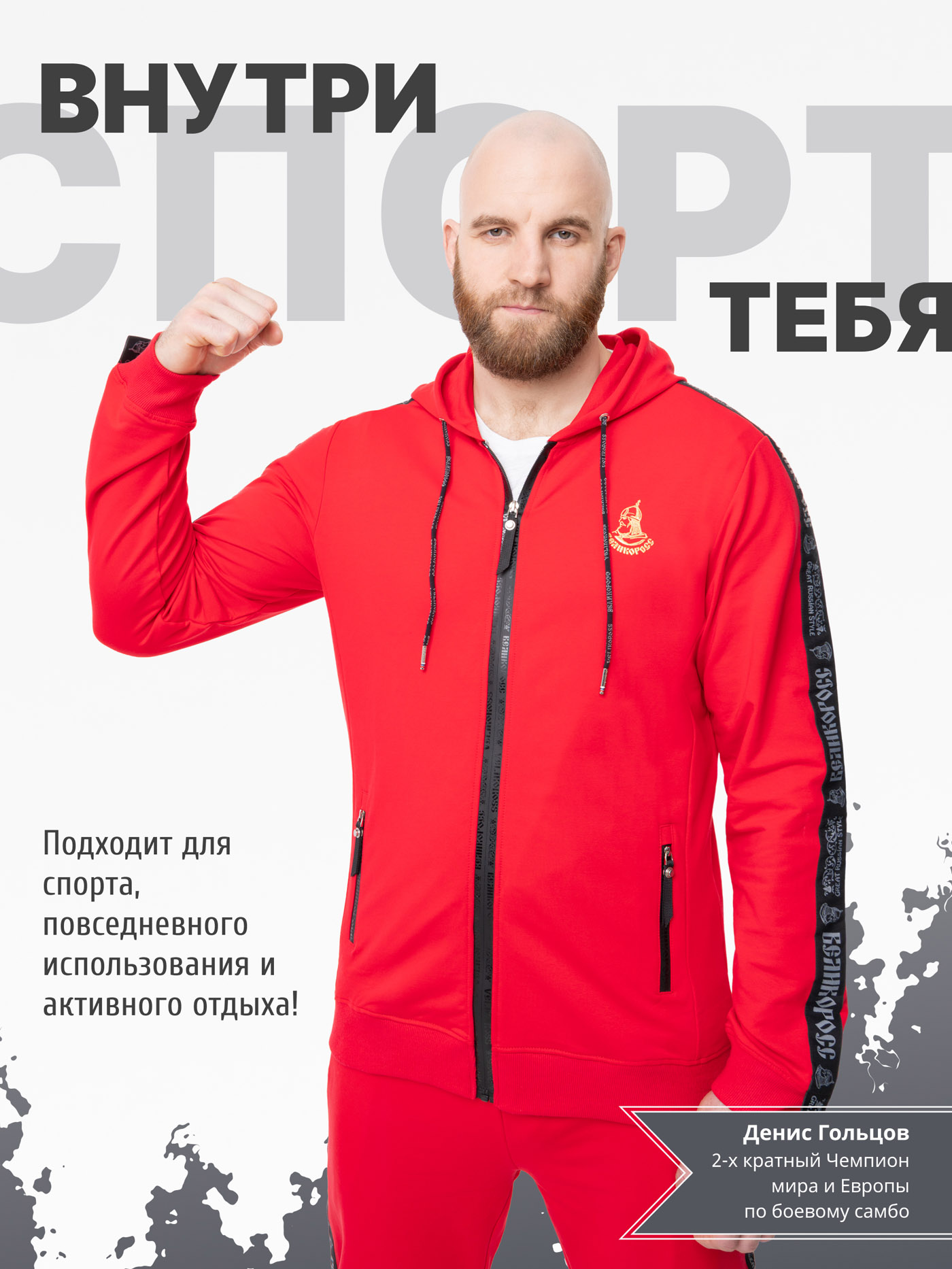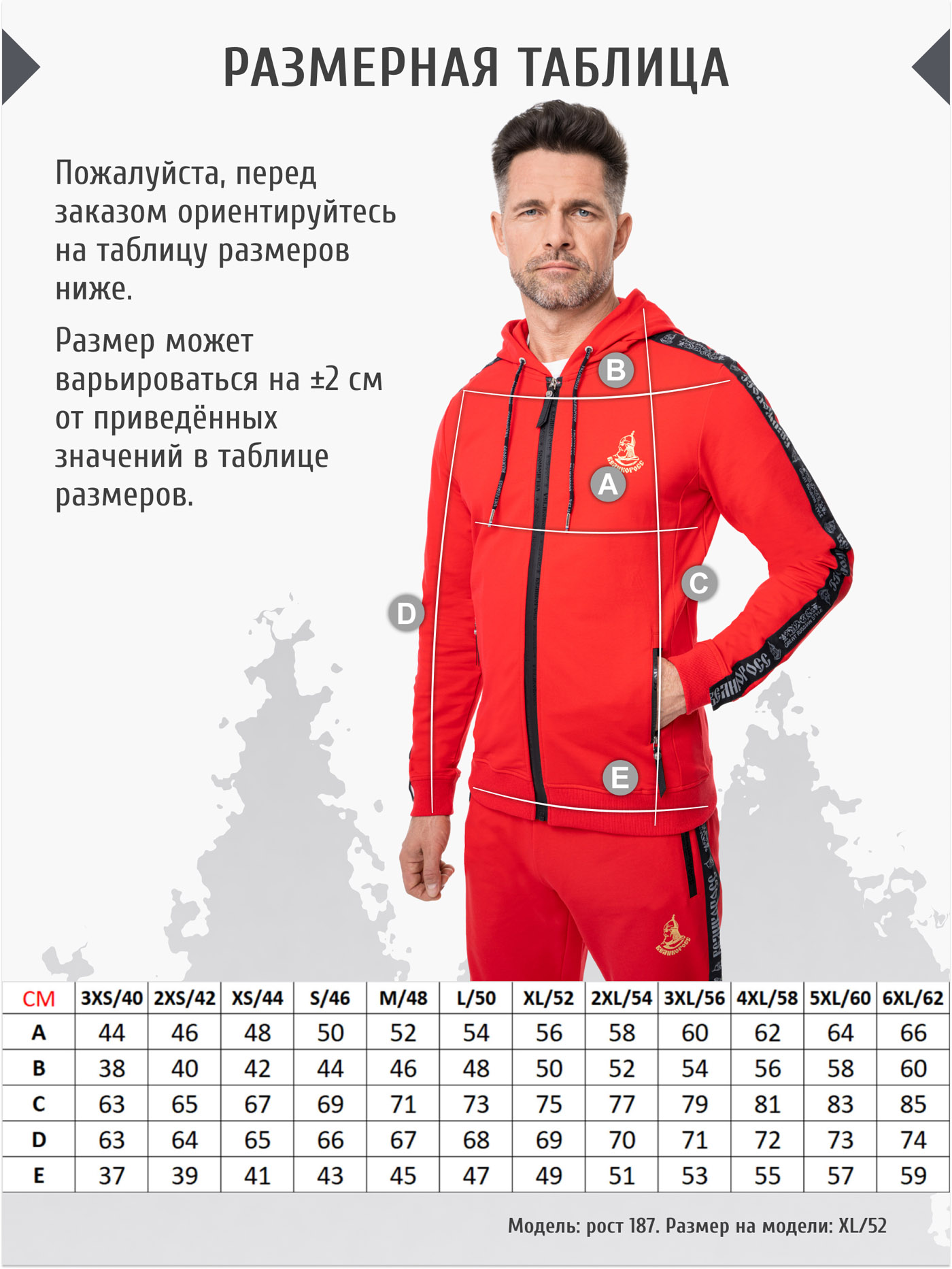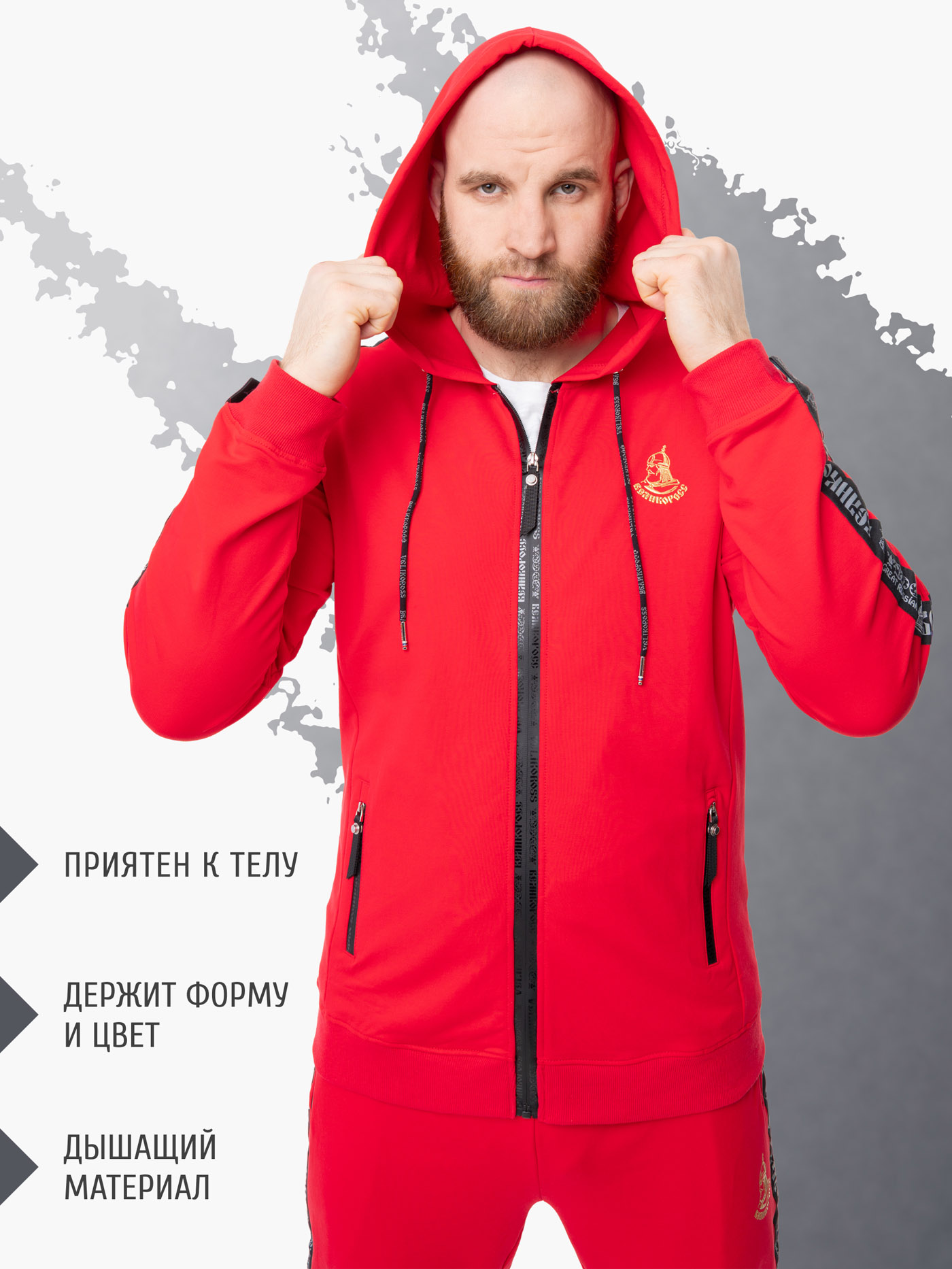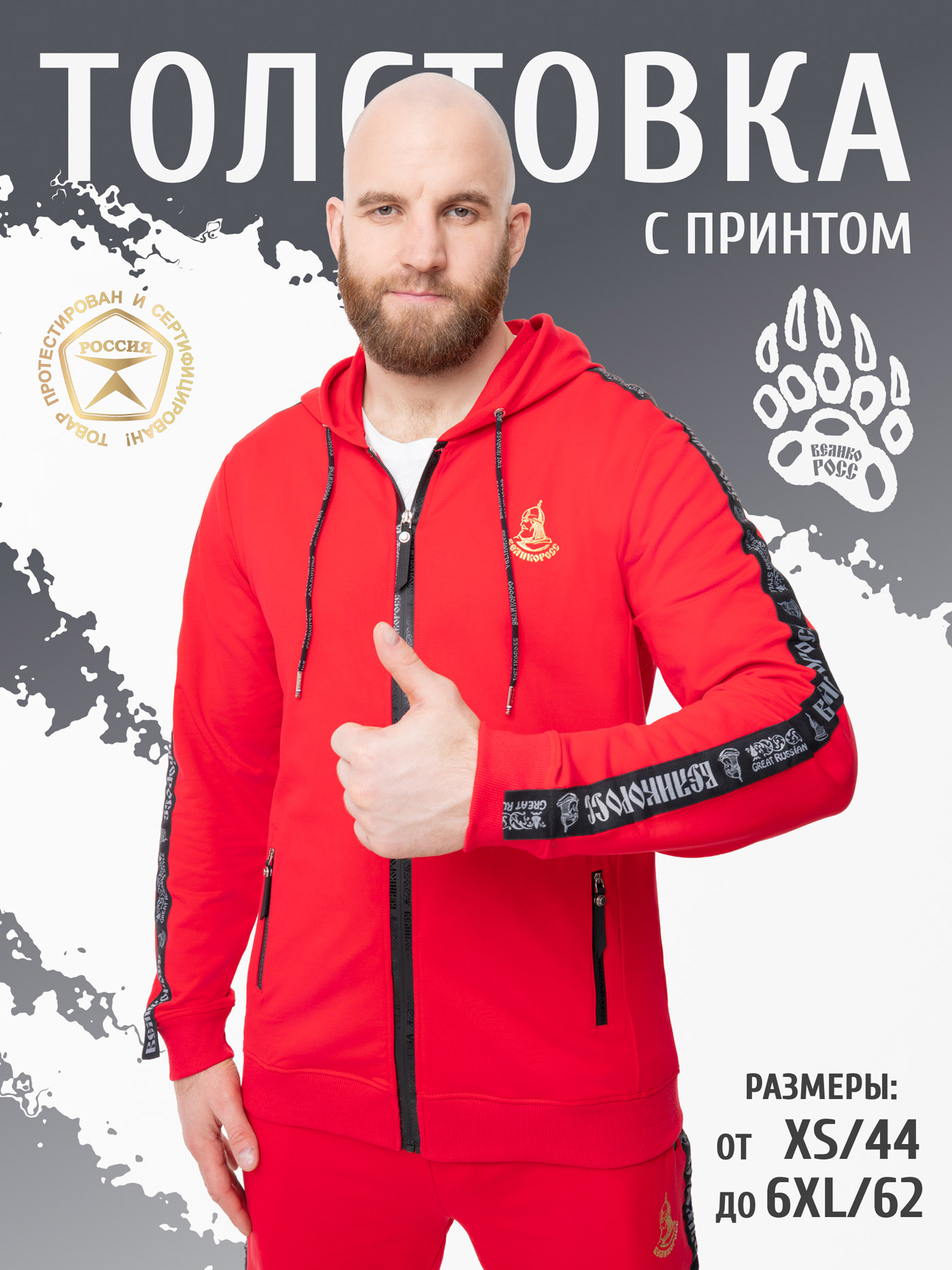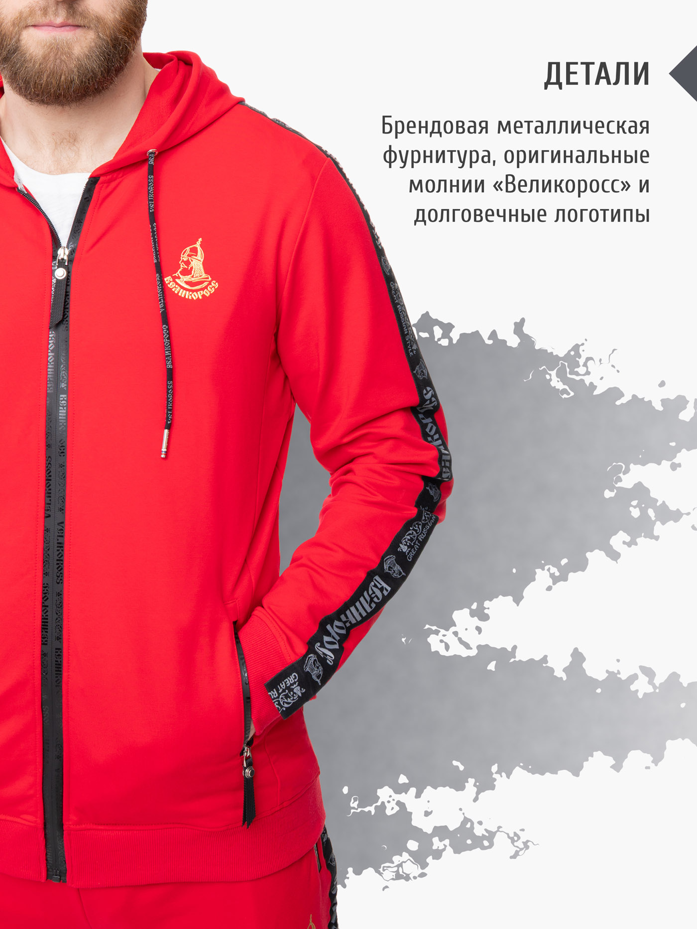 Высокотехнологичное долговечное силиконовое нанесение логотипов – выдерживает максимальную температуру утюга и стирки. Задний внутренний карман на спортивных штанах основательно пришит к поясу и не отвиснет, даже если в него положить толстый бумажник или паспорт. Карман надёжно закрывается оригинальной молнией Великоросс. Все размеры по ГОСТу РФ (не маломерят) от XS/44 до "Богатырского" 6XL/62.