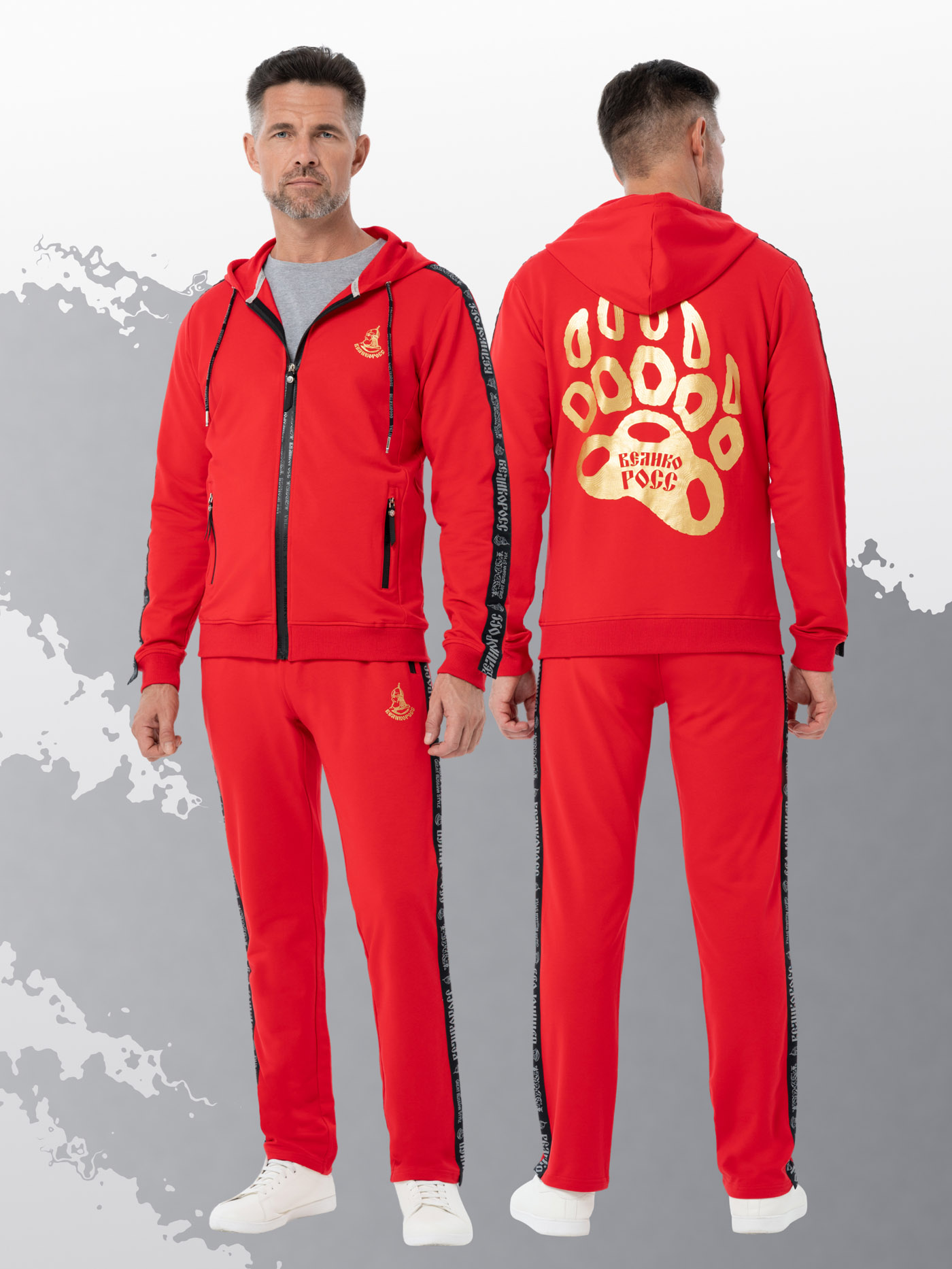 Лёгкий хлопковый футер обеспечивает комфортную температуру для Вашего тела и не стесняет даже самых интенсивных движений. Костюм идеально подходит как для занятий спортом так и для ежедневных приятных прогулок, комфортного пребывания и дома, в дороге или в гостях. Боковые и задние карманы закрываются надёжными молниями Великоросс. Фирменные жаккардовые шнурки с брендовой металлической фурнитурой, оригинальные молнии Великоросс защищающие Вас от ветра, долговечные логотипы на ткани. Широкие жаккардовые фирменные лампасы, карманы с особо прочными молниями Великоросс.